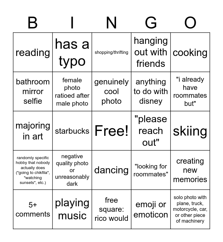 This bingo card has a free space and 70 words: snowboarding, skiing, "go outdoors", listening to music, playing music, making new friends, hanging out with friends, going to the gym/working out, cooking, concerts, creating new memories, meeting new people, reading, shopping/thrifting, hiking, starbucks, dancing, anything to do with disney, partying, randomly specific hobby that nobody actually does ("going to chikfila", "watching sunsets", etc.), "please reach out", "looking for roommates", "i already have roommates but", fully committed, 100% committed, i plan on rushing, <100% committed (or any variation), "extrovert", emoji or emoticon, specifically ":)", has a typo, multiple exclamation points in any sentence, says something obvious (i am going to unr, will be attending unr in the fall), any generic greeting as the first word, enumerates individual music artists, emoji that doesn't render on my computer, animal in photo, multiple people in photo, photo in front of non-bathroom mirror, bathroom mirror selfie, face is obscured and facing towards camera, negative quality photo or unreasonably dark, solo photo with plane, truck, motorcycle, car, or other piece of machinery, face is unreasonably close to camera, male photo ratioed after female photo, female photo ratioed after male photo, 5+ comments, unhinged comment, "View hidden comments", unhinged post, 10 images (full reel), muted and deafened (< 10 words in post), yapping (> 100 words in post), professional photo followed by all crappy photos, free square: rico would, picture can be geoguessed, genuinely cool photo, majoring in kinesiology, majoring in psychology, majoring in pre-nursing, majoring in art, majoring in business, majoring in undecided/exploratory, majoring in music, majoring in (major we haven't heard of before), came to unr for no reason (not california, not nevada), comes from cali city with population <50k, came to unr for sports, comes from washoe county high school and is named one of the top ten baby names in the united states (either female or male, even if gender doesn't match).
