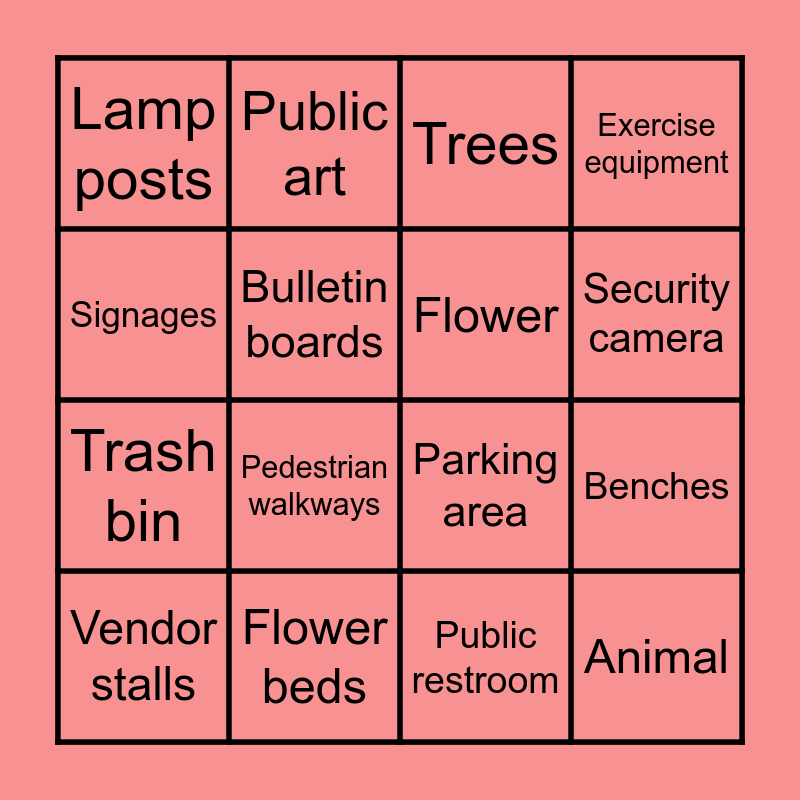 This bingo card has 16 words: Flower beds, Benches, Trees, Lamp posts, Trash bin, Public art, Parking area, Public restroom, Signages, Bulletin boards, Vendor stalls, Exercise equipment, Pedestrian walkways, Security camera, Flower and Animal.