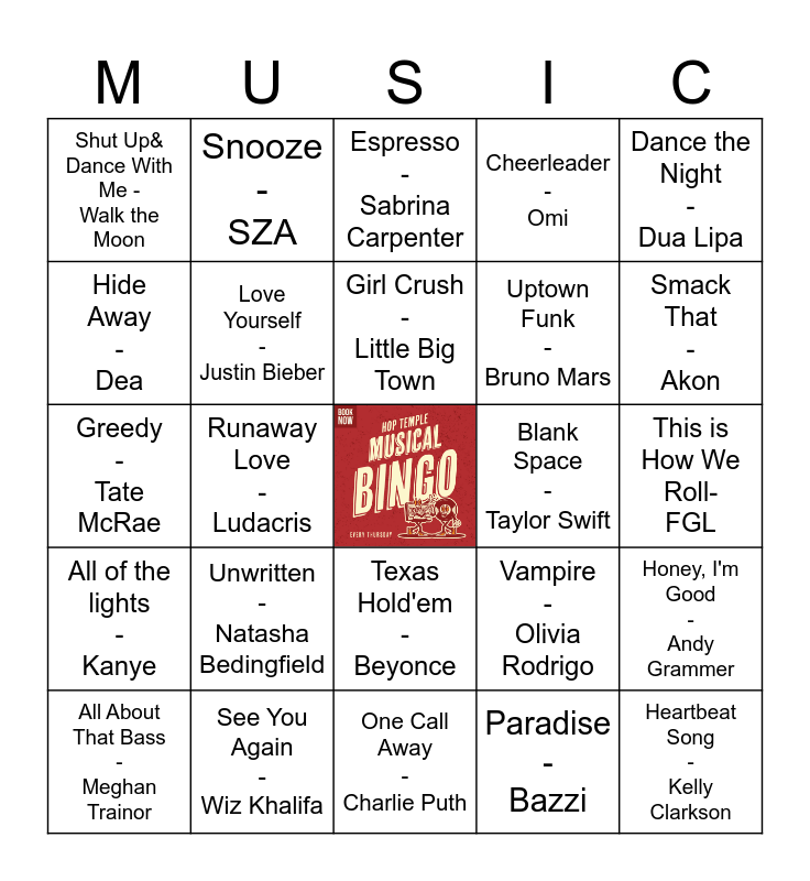 This bingo card has a free space and 30 words: Wildest Dreams - Taylor Swift, See You Again - Wiz Khalifa, Espresso - Sabrina Carpenter, Heartless - The Weeknd, Dance the Night - Dua Lipa, Shut Up& Dance With Me - Walk the Moon, Love Yourself - Justin Bieber, Girl Crush - Little Big Town, Uptown Funk - Bruno Mars, Heartbeat Song - Kelly Clarkson, All About That Bass - Meghan Trainor, Unwritten - Natasha Bedingfield, Paradise - Bazzi, Bad Blood - Taylor Swift, All of the lights - Kanye, The Best Day of My Life - American Authors, One Call Away - Charlie Puth, Blank Space - Taylor Swift, Honey, I'm Good - Andy Grammer, Hide Away - Dea, Runaway Love - Ludacris, Stitches - Shawn Mendez, Cheerleader - Omi, This is How We Roll- FGL, Greedy - Tate McRae, Snooze - SZA, Texas Hold'em - Beyonce, Vampire - Olivia Rodrigo, Smack That - Akon and Kill Bill - SZA.