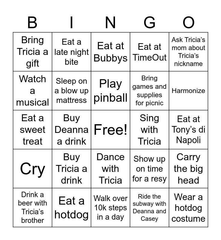 This bingo card has a free space and 24 words: Buy Tricia a drink, Eat a hotdog, Play pinball, Drink a beer with Tricia’s brother, Ask Tricia’s mom about Tricia’s nickname, Bring Tricia a gift, Watch a musical, Eat a late night bite, Sing with Tricia, Dance with Tricia, Bring games and supplies for picnic, Eat a sweet treat, Show up on time for a resy, Carry the big head, Sleep on a blow up mattress, Ride the subway with Deanna and Casey, Eat at Tony’s di Napoli, Eat at Bubbys, Harmonize, Buy Deanna a drink, Wear a hotdog costume, Cry, Eat at TimeOut and Walk over 10k steps in a day.