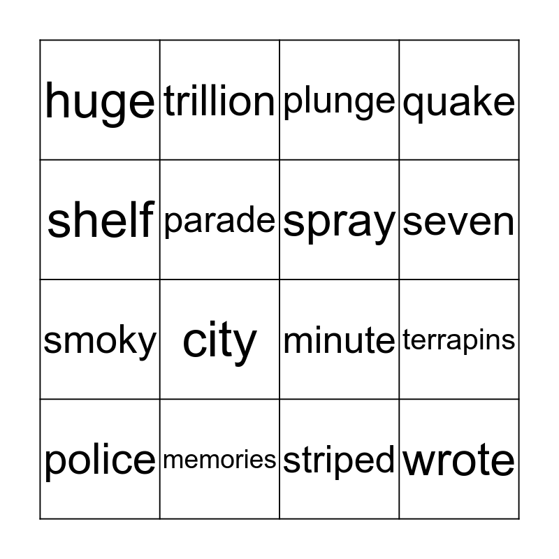 This bingo card has a free space and 15 words: police, wrote, plunge, huge, seven, shelf, city, striped, parade, smoky, terrapins, quake, spray, trillion and memories.