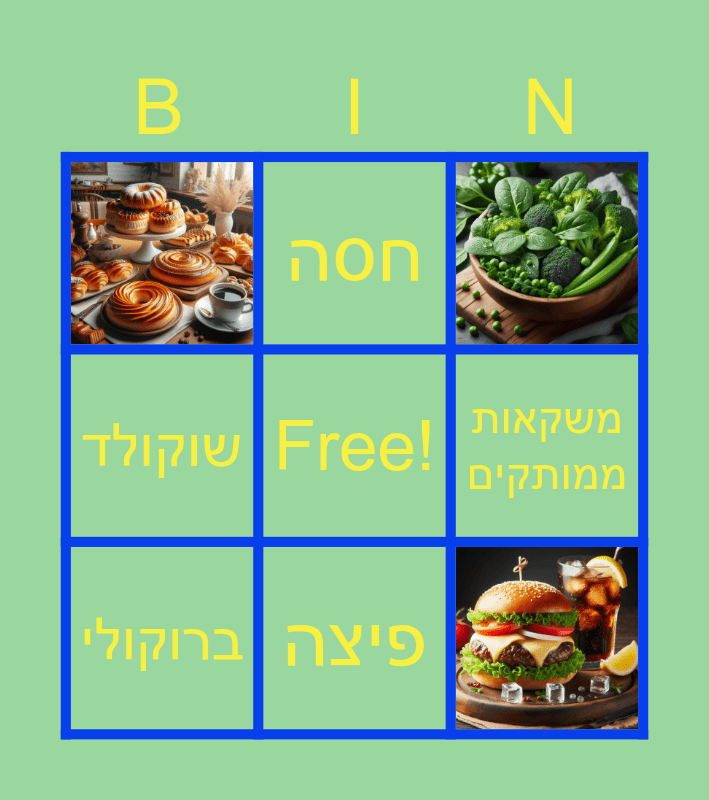 This bingo card has 6 images, a free space and 10 words: עוף, ספגטי, פיצה, משקאות ממותקים, מים, גלידות, שוקולד, ברוקולי, חסה and עבניות.