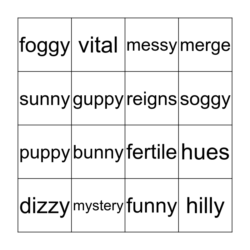 This bingo card has a free space and 15 words: dizzy, hilly, messy, foggy, soggy, sunny, bunny, funny, guppy, puppy, hues, merge, reigns, vital and mystery.