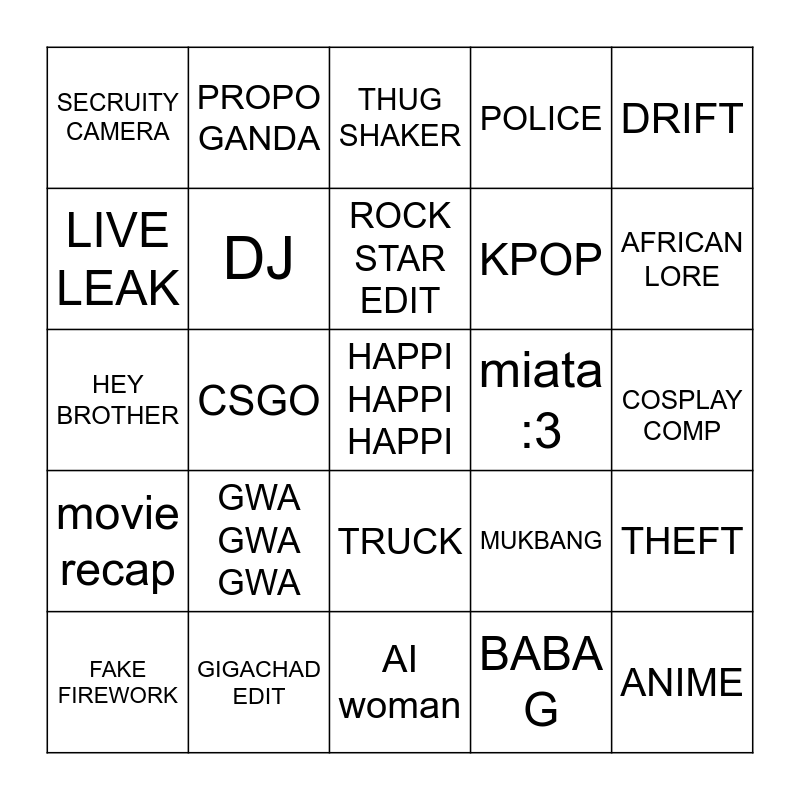 This bingo card has a free space and 24 words: GWA GWA GWA, GIGACHAD EDIT, ROCK STAR EDIT, FAKE FIREWORK, DRIFT, SECRUITY CAMERA, LIVE LEAK, PROPO GANDA, miata :3, TRUCK, KPOP, HEY BROTHER, MUKBANG, THEFT, DJ, BABA G, COSPLAY COMP, THUG SHAKER, AFRICAN LORE, CSGO, ANIME, movie recap, POLICE and AI woman.