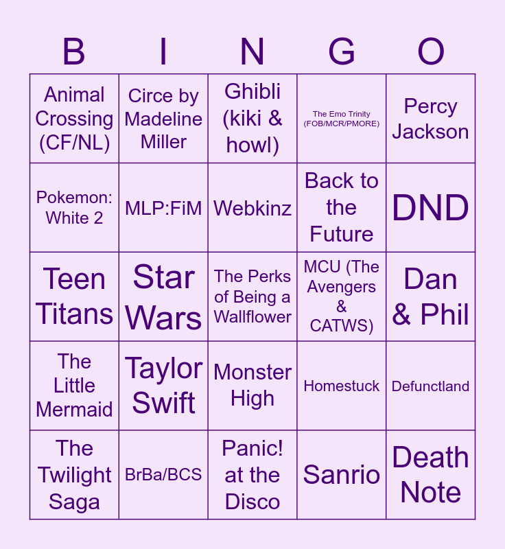 This bingo card has 25 words: Taylor Swift, Panic! at the Disco, Webkinz, The Twilight Saga, Percy Jackson, Animal Crossing (CF/NL), Pokemon: White 2, Circe by Madeline Miller, MCU (The Avengers & CATWS), Monster High, Back to the Future, Teen Titans, Homestuck, Defunctland, MLP:FiM, Death Note, Dan & Phil, Ghibli (kiki & howl), DND, Star Wars, The Perks of Being a Wallflower, BrBa/BCS, The Little Mermaid, The Emo Trinity (FOB/MCR/PMORE) and Sanrio.