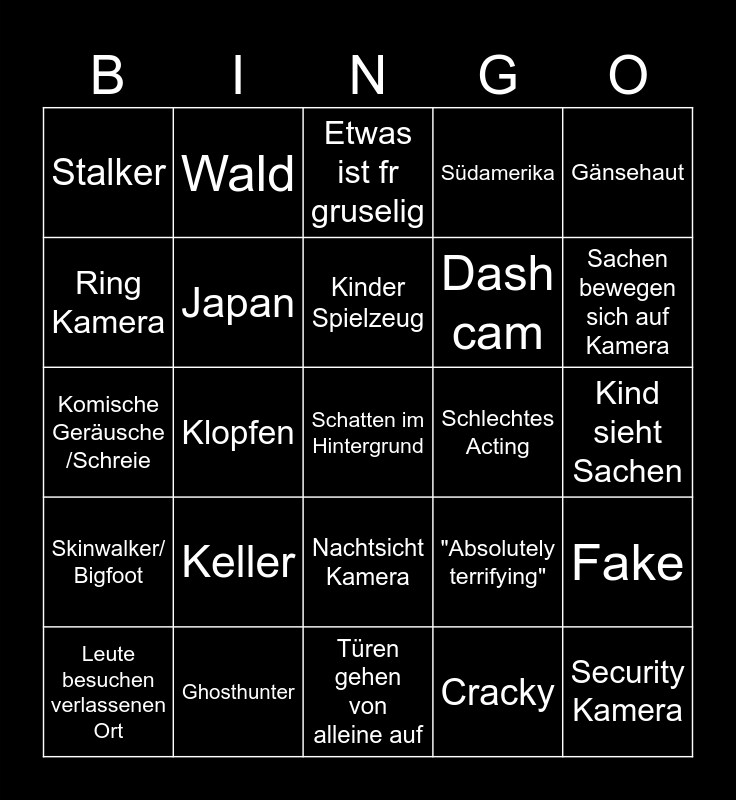 This bingo card has a free space and 24 words: Keller, Ghosthunter, Kinder Spielzeug, Leute besuchen verlassenen Ort, Gänsehaut, Stalker, Ring Kamera, Wald, Schlechtes Acting, Nachtsicht Kamera, Dash cam, Komische Geräusche /Schreie, "Absolutely terrifying", Fake, Japan, Cracky, Kind sieht Sachen, Etwas ist fr gruselig, Sachen bewegen sich auf Kamera, Klopfen, Security Kamera, Skinwalker/ Bigfoot, Südamerika and Türen gehen von alleine auf.