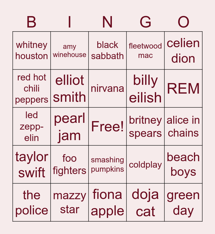 This bingo card has a free space and 24 words: foo fighters, mazzy star, nirvana, the police, celien dion, whitney houston, red hot chili peppers, amy winehouse, britney spears, smashing pumpkins, billy eilish, led zepp-elin, coldplay, beach boys, elliot smith, doja cat, alice in chains, black sabbath, REM, pearl jam, green day, taylor swift, fleetwood mac and fiona apple.