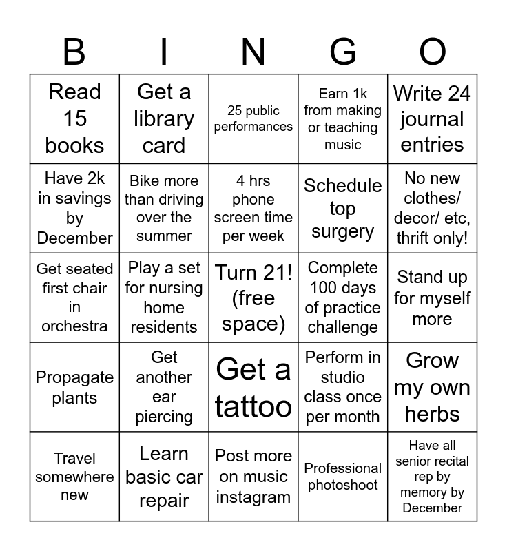 This bingo card has a free space and 24 words: Get another ear piercing, Learn basic car repair, 4 hrs phone screen time per week, Travel somewhere new, Write 24 journal entries, Read 15 books, Have 2k in savings by December, Get a library card, Complete 100 days of practice challenge, Get a tattoo, Schedule top surgery, Get seated first chair in orchestra, Perform in studio class once per month, Grow my own herbs, Bike more than driving over the summer, Professional photoshoot, Stand up for myself more, 25 public performances, No new clothes/ decor/ etc, thrift only!, Play a set for nursing home residents, Have all senior recital rep by memory by December, Propagate plants, Earn 1k from making or teaching music and Post more on music instagram.