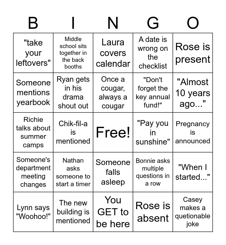 This bingo card has a free space and 28 words: "When I started...", Retirement is announced, "Don't forget the key annual fund!", Rose is absent, Someone mentions yearbook, Laura covers calendar, Middle school sits together in the back booths, Someone's department meeting changes, "Pay you in sunshine", Lynn says "Woohoo!", Richie talks about summer camps, A date is wrong on the checklist, The new building is mentioned, You GET to be here, "Almost 10 years ago...", FREE DAYCARE, Nathan asks someone to start a timer, Ryan gets in his drama shout out, Once a cougar, always a cougar, Someone falls asleep, "take your leftovers", Steve compares us to Disneyland, Casey makes a quetionable joke, Chik-fil-a is mentioned, Pregnancy is announced, Bonnie asks multiple questions in a row, Rose is present and We get to read the schedule for the week.