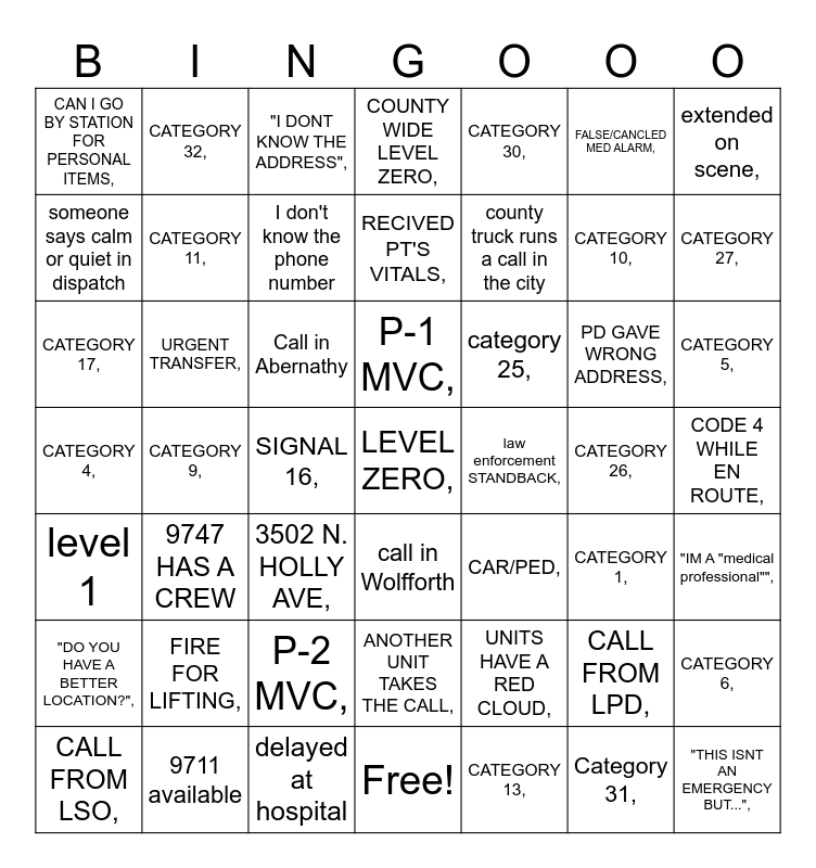 This bingo card has 54 words: Free!, URGENT TRANSFER,, MEDICAL ALARM,, law enforcement STANDBACK,, P-1 MVC,, "DO YOU HAVE A BETTER LOCATION?",, COUNTY WIDE LEVEL ZERO,, NON-EMERGENT TRANSFER,, FALSE/CANCLED MED ALARM,, FIRE FOR LIFTING,, CAN I GO BY STATION FOR PERSONAL ITEMS,, CATEGORY 1,, CATEGORY 4,, CATEGORY 5,, CATEGORY 6,, CATEGORY 9,, CATEGORY 10,, CATEGORY 11,, CATEGORY 13,, CATEGORY 17,, category 25,, CATEGORY 26,, CATEGORY 27,, CATEGORY 30,, Category 31,, CATEGORY 32,, 3502 N. HOLLY AVE,, "THIS ISNT AN EMERGENCY BUT...",, CODE 4 WHILE EN ROUTE,, SIGNAL 16,, "DONT COME WITH LIGHTS AND SIRENS",, CAR/PED,, CALL FROM LPD,, CALL FROM LSO,, "I DONT KNOW THE ADDRESS",, "IM A "medical professional"",, RECIVED PT'S VITALS,, PD GAVE WRONG ADDRESS,, LEVEL ZERO,, extended on scene,, P-2 MVC,, ANOTHER UNIT TAKES THE CALL,, UNITS HAVE A RED CLOUD,, down for decon, Call in Abernathy, 9711 available, call in Wolfforth, level 1, someone says calm or quiet in dispatch, county truck runs a call in the city, I don't know the phone number, delayed at hospital, 9747 HAS A CREW and 9750 HAS A MEDIC CREW.