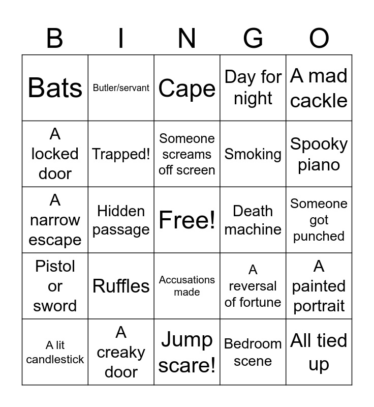 This bingo card has a free space and 24 words: Ruffles, A creaky door, Someone screams off screen, A lit candlestick, A mad cackle, Bats, A locked door, Butler/servant, Death machine, Accusations made, Smoking, A narrow escape, A reversal of fortune, A painted portrait, Trapped!, Bedroom scene, Someone got punched, Cape, Spooky piano, Hidden passage, All tied up, Pistol or sword, Day for night and Jump scare!.
