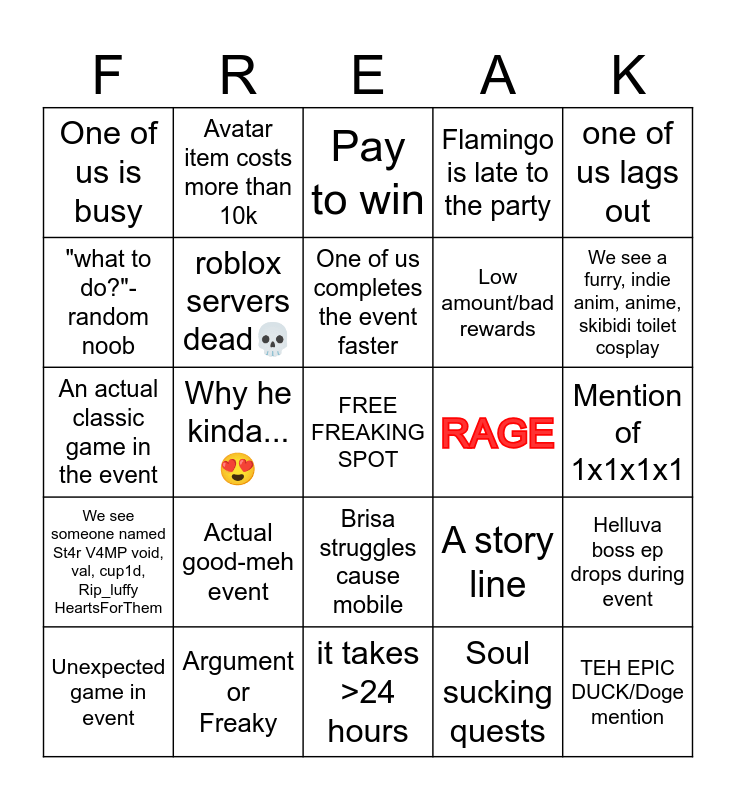 This bingo card has a free space and 24 words: Unexpected game in event, Actual good-meh event, One of us completes the event faster, Soul sucking quests, one of us lags out, One of us is busy, Avatar item costs more than 10k, Pay to win, RAGE, Mention of 1x1x1x1, An actual classic game in the event, roblox servers dead💀, A story line, Helluva boss ep drops during event, "what to do?"- random noob, Argument or Freaky, it takes >24 hours, Flamingo is late to the party, We see a furry, indie anim, anime, skibidi toilet cosplay, We see someone named St4r V4MP void, val, cup1d, Rip_luffy HeartsForThem, Why he kinda...😍, Brisa struggles cause mobile, Low amount/bad rewards and TEH EPIC DUCK/Doge mention.