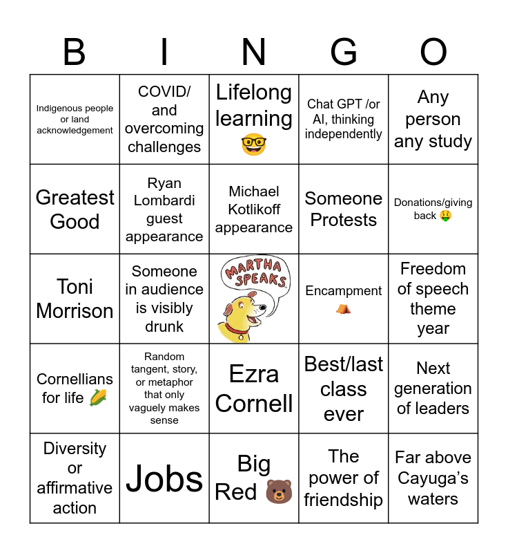 This bingo card has a free space and 24 words: Random tangent, story, or metaphor that only vaguely makes sense, Jobs, Michael Kotlikoff appearance, Diversity or affirmative action, Any person any study, Indigenous people or land acknowledgement, Greatest Good, COVID/ and overcoming challenges, Encampment ⛺️, Ezra Cornell, Someone Protests, Toni Morrison, Best/last class ever, Next generation of leaders, Ryan Lombardi guest appearance, The power of friendship, Freedom of speech theme year, Lifelong learning 🤓, Donations/giving back 🤑, Someone in audience is visibly drunk, Far above Cayuga’s waters, Cornellians for life 🌽, Chat GPT /or AI, thinking independently and Big Red 🐻.