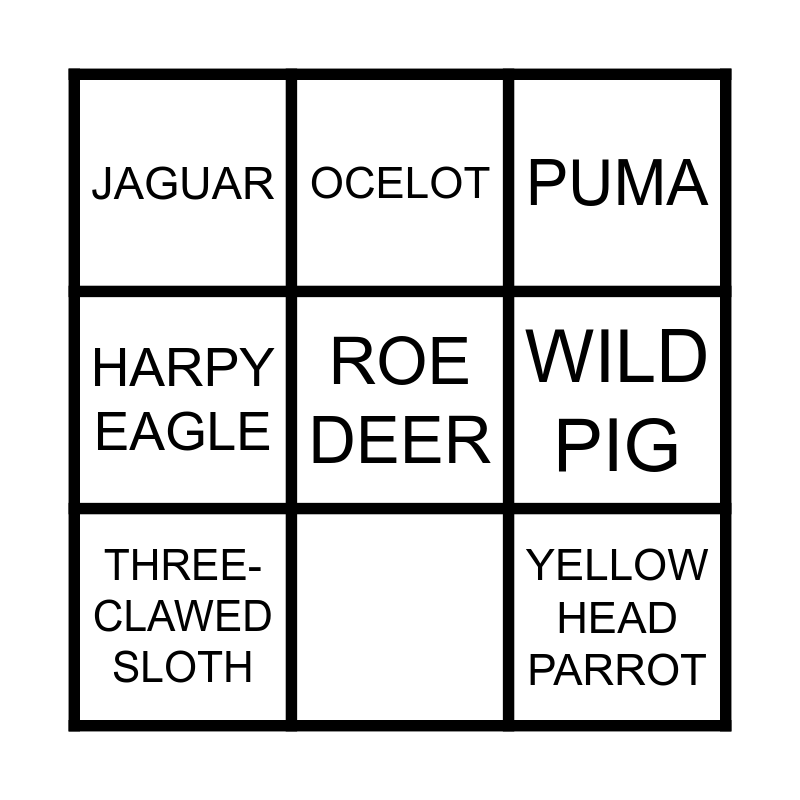 This bingo card has 10 words: Free!, PUMA, JAGUAR, ROE DEER, HARPY EAGLE, THREE-CLAWED SLOTH, OCELOT, TAPIR, WILD PIG and YELLOW HEAD PARROT.