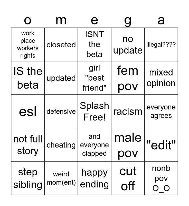 This bingo card has a free space and 24 words: cheating, weird mom(ent), girl "best friend", step sibling, illegal????, work place workers rights, IS the beta, closeted, racism, and everyone clapped, fem pov, esl, male pov, "edit", updated, cut off, everyone agrees, ISNT the beta, mixed opinion, defensive, nonb pov O_O, not full story, no update and happy ending.