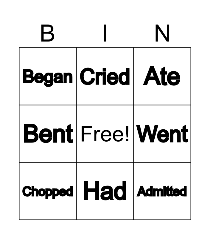 This bingo card has a free space and 8 words: Went, Ate, Cried, Chopped, Began, Admitted, Bent and Had.