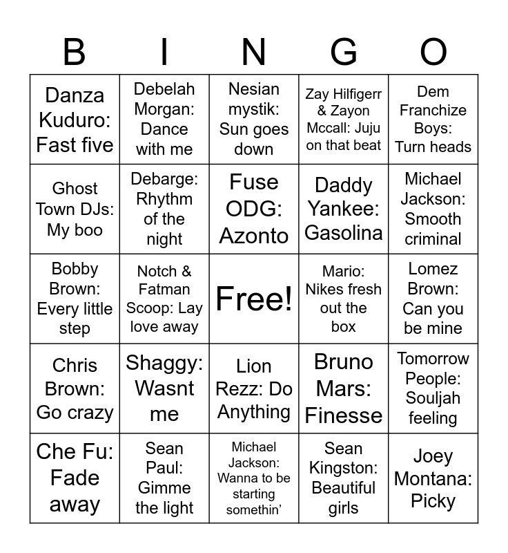 This bingo card has a free space and 29 words: Che Fu: Fade away, Jack Harlow: Loving on me, Notch & Fatman Scoop: Lay love away, Usher: Confessions, Danza Kuduro: Fast five, Nesian mystik: Sun goes down, Debarge: Rhythm of the night, Shaggy: Wasnt me, Mario: Nikes fresh out the box, Sean Paul: Gimme the light, Lomez Brown: Can you be mine, Joey Montana: Picky, Michael Jackson: Wanna to be starting somethin’, Sean Kingston: Beautiful girls, Michael Jackson: Smooth criminal, Monica: Just another girl, Lion Rezz: Do Anything, Chris Brown: Go crazy, Dem Franchize Boys: Turn heads, Bobby Brown: Every little step, Bruno Mars: Finesse, Toni Braxton: He wasn’t man enough, Daddy Yankee: Gasolina, Ghost Town DJs: My boo, Zay Hilfigerr & Zayon Mccall: Juju on that beat, Debelah Morgan: Dance with me, Tomorrow People: Souljah feeling, Fuse ODG: Azonto and Coolio: Fantastic Voyage.