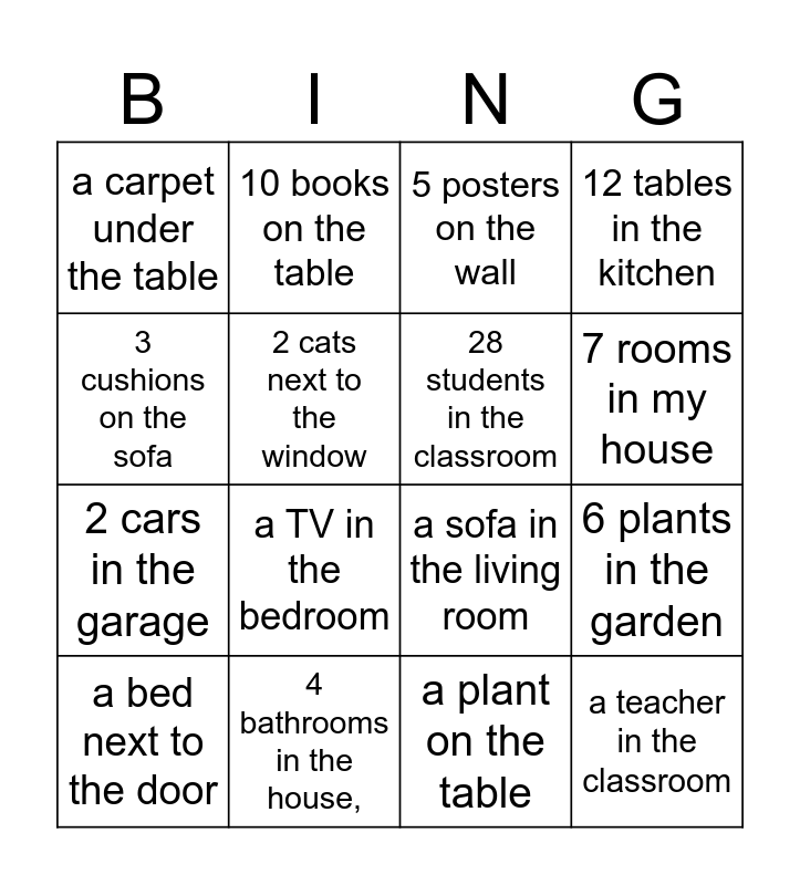 This bingo card has 20 words: 6 plants in the garden, a lamp on the desk, 5 posters on the wall, a fridge in the kitchen, a bed next to the door, 3 cushions on the sofa, 4 bathrooms in the house,, a carpet under the table, 2 cars in the garage, 10 books on the table, a TV in the bedroom, a sofa in the living room, 2 cats next to the window, a teacher in the classroom, 28 students in the classroom, a dog under the tree, 7 rooms in my house, 12 tables in the kitchen, a plant on the table and a book under the bed.
