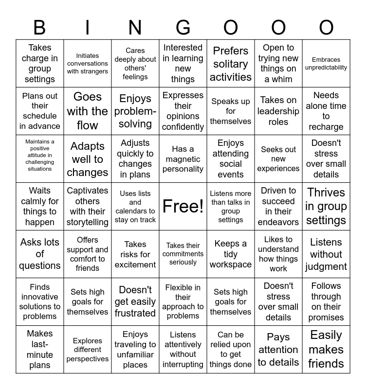 This bingo card has a free space and 48 words: Sets high goals for themselves, Takes on leadership roles, Listens attentively without interrupting, Captivates others with their storytelling, Adjusts quickly to changes in plans, Thrives in group settings, Initiates conversations with strangers, Explores different perspectives, Open to trying new things on a whim, Takes their commitments seriously, Embraces unpredictability, Interested in learning new things, Seeks out new experiences, Enjoys attending social events, Finds innovative solutions to problems, Driven to succeed in their endeavors, Plans out their schedule in advance, Needs alone time to recharge, Doesn't stress over small details, Prefers solitary activities, Speaks up for themselves, Uses lists and calendars to stay on track, Takes charge in group settings, Goes with the flow, Follows through on their promises, Enjoys problem-solving, Doesn't stress over small details, Makes last-minute plans, Has a magnetic personality, Adapts well to changes, Pays attention to details, Listens more than talks in group settings, Listens without judgment, Sets high goals for themselves, Waits calmly for things to happen, Keeps a tidy workspace, Likes to understand how things work, Maintains a positive attitude in challenging situations, Takes risks for excitement, Doesn't get easily frustrated, Asks lots of questions, Easily makes friends, Cares deeply about others' feelings, Enjoys traveling to unfamiliar places, Expresses their opinions confidently, Flexible in their approach to problems, Offers support and comfort to friends and Can be relied upon to get things done.