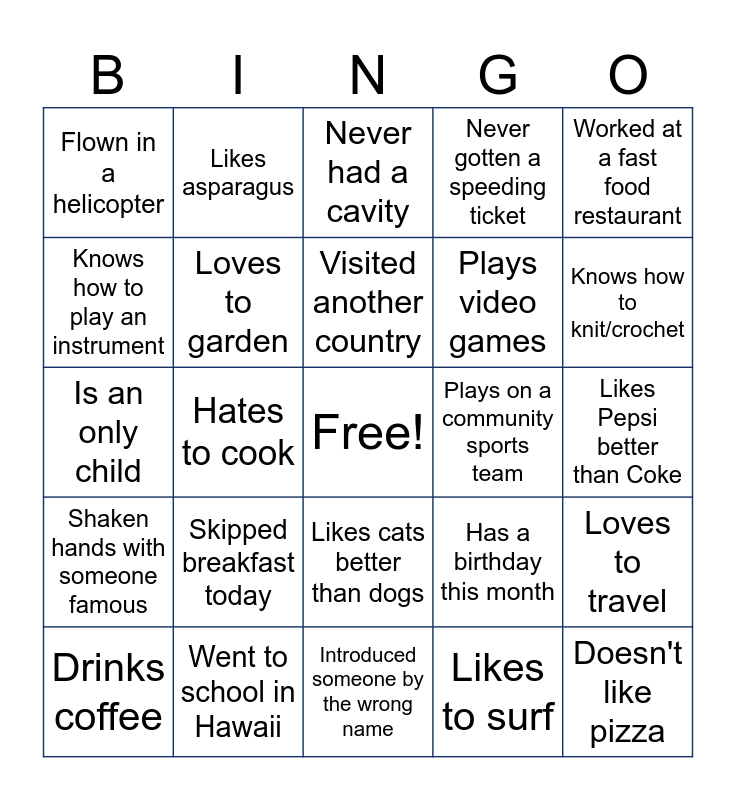 This bingo card has a free space and 24 words: Skipped breakfast today, Went to school in Hawaii, Visited another country, Drinks coffee, Worked at a fast food restaurant, Flown in a helicopter, Knows how to play an instrument, Likes asparagus, Plays on a community sports team, Likes cats better than dogs, Plays video games, Is an only child, Has a birthday this month, Loves to travel, Loves to garden, Likes to surf, Likes Pepsi better than Coke, Never had a cavity, Knows how to knit/crochet, Hates to cook, Doesn't like pizza, Shaken hands with someone famous, Never gotten a speeding ticket and Introduced someone by the wrong name.