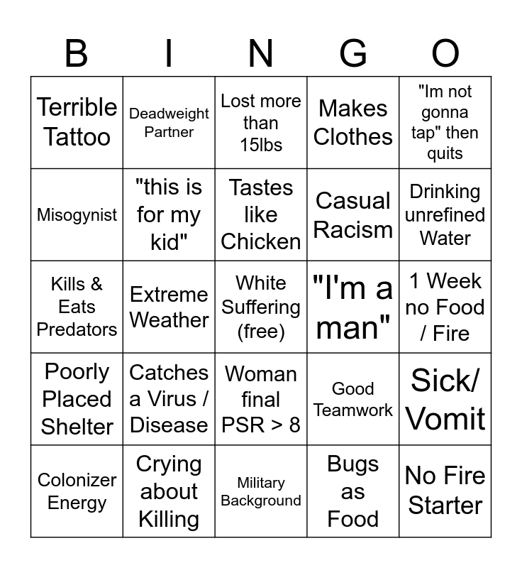 This bingo card has a free space and 24 words: Catches a Virus / Disease, Crying about Killing, Tastes like Chicken, Colonizer Energy, "Im not gonna tap" then quits, Terrible Tattoo, Misogynist, Deadweight Partner, "I'm a man", Woman final PSR > 8, Casual Racism, Kills & Eats Predators, Good Teamwork, Sick/ Vomit, "this is for my kid", Bugs as Food, 1 Week no Food / Fire, Lost more than 15lbs, Drinking unrefined Water, Extreme Weather, No Fire Starter, Poorly Placed Shelter, Makes Clothes and Military Background.