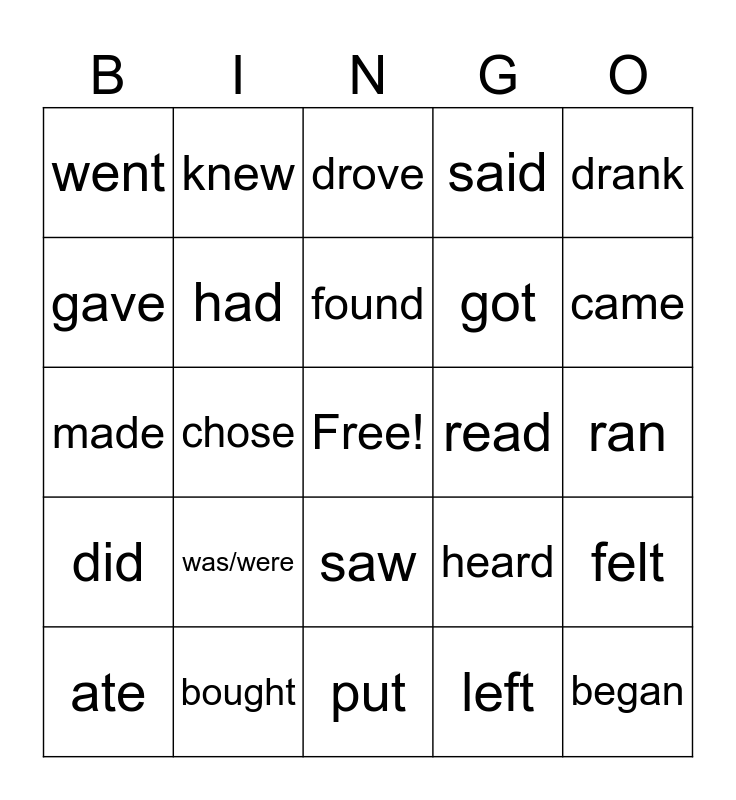 This bingo card has a free space and 24 words: was/were, bought, found, ate, drank, went, gave, knew, read, saw, got, made, heard, felt, had, left, ran, drove, came, chose, began, did, said and put.