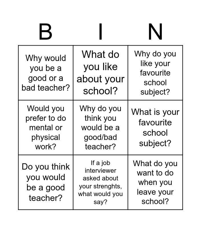 This bingo card has a free space and 8 words: What is your favourite school subject?, Why do you like your favourite school subject?, What do you like about your school?, Do you think you would be a good teacher?, Why would you be a good or a bad teacher?, What do you want to do when you leave your school?, Would you prefer to do mental or physical work? and If a job interviewer asked about your strenghts, what would you say?.