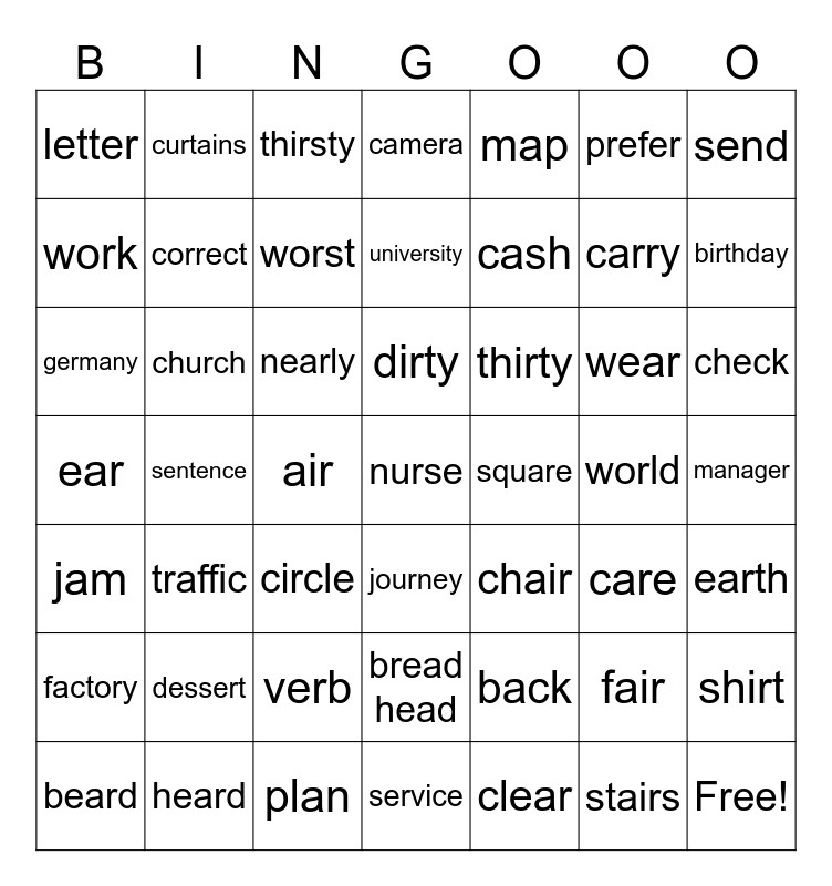This bingo card has 57 words: Free!, check, leg, letter, sentence, bread head, send, cheque, correct, back, camera, factory, jam, manager, plan, traffic, map, cash, jacket, carry, birthday, circle, thirty, thirsty, word, work, world, worse, worst, journey, early, earth, heard, service, germany, prefer, dessert, university, verb, church, curtains, dirty, nurse, purse, shirt, beard, nearly, ear, clear, care, square, air, chair, fair, stairs, wear and aeroplane.