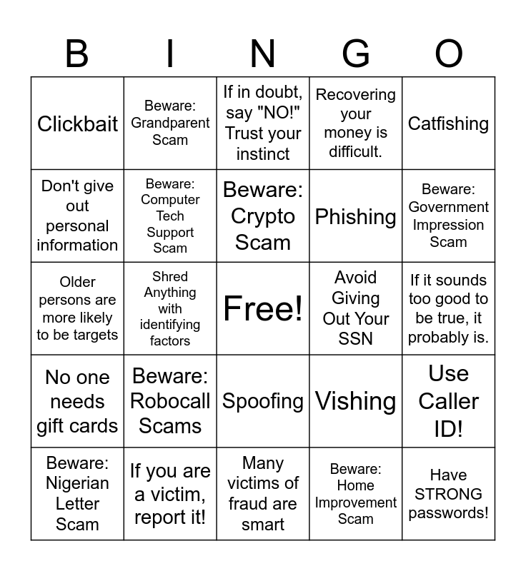 This bingo card has a free space and 28 words: Use Caller ID!, When in doubt, check out the company, Phishing, Beware: Home Improvement Scam, Don't give out personal information, If in doubt, say "NO!" Trust your instinct, Beware: Grandparent Scam, No one needs gift cards, Avoid Giving Out Your SSN, Beware: Nigerian Letter Scam, Older persons are more likely to be targets, Recovering your money is difficult., If you are a victim, report it!, Many victims of fraud are smart, Beware: Government Impression Scam, Beware: Lottery Scams, Beware: Robocall Scams, Beware: Computer Tech Support Scam, Beware: Crypto Scam, Spoofing, Clickbait, Identity Theft, Have STRONG passwords!, Shred Anything with identifying factors, If it sounds too good to be true, it probably is., Vishing, Catfishing and Peer-to-peer payment apps.