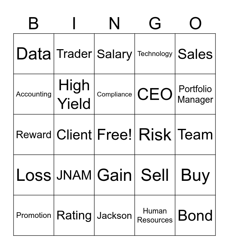 This bingo card has a free space and 46 words: Stock, Bond, PPM, Jackson, JNAM, Investment, Trader, Fund, Accounting, Finance, High Yield, Technology, Buy, Sell, Hold, Legal, Compliance, Risk, Marketing, Sales, Client, Human Resources, Data, CEO, Research, Portfolio Manager, Promotion, Philanthropy, Gain, Loss, Insurance, Income, Advisor, Audit, Return, Rating, Team, Performance, Index, Communication, Benefits, Salary, Reward, Co-worker, Debt and Equity.