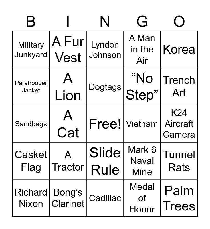 This bingo card has a free space and 61 words: Bong’s Hunting Rifle, Bong’s Clarinet, Marge’s Wedding Dress, Casket Flag, Medal of Honor, Snow Shoes, A Lion, Binoculars, “No Step”, Blue and Yellow Planes, A Man in the Air, A Ship Being Launched, Paratrooper Jacket, Rosie the Riveter, ID cards, MIlitary Junkyard, Palm Trees, Korea, Super Bazooka, Dogtags, Vietnam, Lyndon Johnson, Richard Nixon, Tunnel Rats, Protest Signs, Gas Mask, Typewritter, Morse Code, Trench Art, Barbed Wire, Letters Home, Purple Heart Award, Bayonets, Hand Grenades, A Fur Vest, A Kilt, Winter Flight Jacket, A Cat, A Missile in the Sky, Sandbags, An Engine, A Tractor, K24 Aircraft Camera, A Sailor’s Uniform, Mark 6 Naval Mine, Marge’s Picture, Harry Truman, Elvis, US Flag, Slide Rule, Cadillac, A Bed, Fork/Knife, A Radio, A Helmet, 25 Japanese Flags, A Swastika, A Saber, Ration Coupons, A lighter and Marge Bowling.