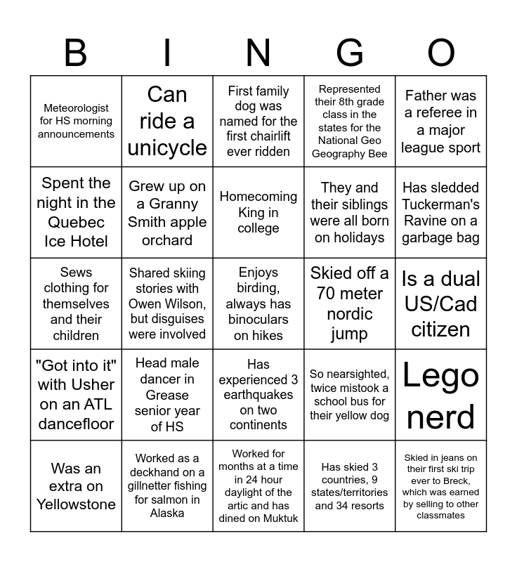 This bingo card has 52 words: Free!, Enjoys birding, always has binoculars on hikes, Driven an aircraft carrier, Worked for months at a time in 24 hour daylight of the artic and has dined on Muktuk, Head male dancer in Grease senior year of HS, Wore a mullet until age 7, Can ride a unicycle, Has trypophobia (fear of holes), Spent the night in the Quebec Ice Hotel, Fell in love at first site, Grew up on a Granny Smith apple orchard, Wanted to be an ichthyologist in 2nd grade, Lego nerd, So nearsighted, twice mistook a school bus for their yellow dog, Has ridden the horse from Hidalgo, Circumnavigated the world by sailboat, Homecoming King in college, Skied off a 70 meter nordic jump, Enjoys cross stitching, Father was a referee in a major league sport, Shared skiing stories with Owen Wilson, but disguises were involved, Has skied 3 countries, 9 states/territories and 34 resorts, Meteorologist for HS morning announcements, They and their siblings were all born on holidays, Avid Hunter, Skied in jeans on their first ski trip ever to Breck, which was earned by selling to other classmates, Helped make Meryl Streep's daughter's wedding cake, Childhood dream was to own/operate a bakery or restaurant, Has sledded Tuckerman's Ravine on a garbage bag, Born in England to 2 US spies, Is a 1994 Jr Olympic Qualifier, Represented their 8th grade class in the states for the National Geo Geography Bee, Ham radio nerd, 3rd place in the country for breaststroke on HS swim team, Would show quarter horses as a teen to mid-20s, First family dog was named for the first chairlift ever ridden, Worked as a deckhand on a gillnetter fishing for salmon in Alaska, Has driven a locomotive, Is a beekeeper with 180K bees, Dances flamenco, Was a Boiler Maker in college building large scale air pollution control, Is a dual US/Cad citizen, "Got into it" with Usher on an ATL dancefloor, Lived in Berlin for 3 years, Has experienced 3 earthquakes on two continents, Proposed to his wife at the top of Gunbarrel at Heavenly, Worked in a pharmaceutical R&D lab in HS & College, Sews clothing for themselves and their children, Jumped off the Stratosphere in Vegas multiple times, Volunteers researching Adult Missing Persons cases that have been open for more than 10 years, Was an extra on Yellowstone and Has been stepped on by a horse ridden by John Wayne in his movies.