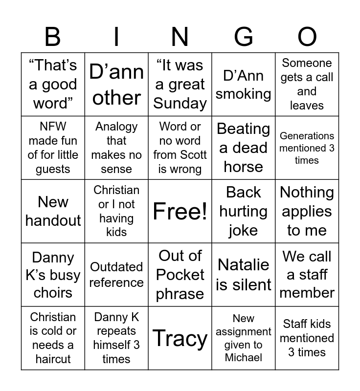 This bingo card has a free space and 26 words: Out of Pocket phrase, New assignment given to Michael, Word or no word from Scott is wrong, Danny K repeats himself 3 times, Someone gets a call and leaves, “That’s a good word”, NFW made fun of for little guests, D’ann other, Nothing applies to me, Natalie is silent, Beating a dead horse, New handout, We call a staff member, Christian is cold or needs a haircut, Christian or I not having kids, Turkeys, D’Ann smoking, Danny K’s busy choirs, “It was a great Sunday, Staff kids mentioned 3 times, Generations mentioned 3 times, Tracy, Back hurting joke, Outdated reference, Analogy that makes no sense and Overblown reaction.