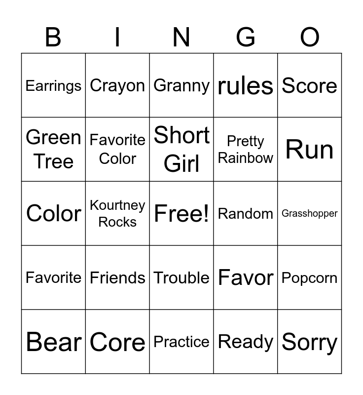 This bingo card has a free space and 43 words: Rabbit, Sorry, Care, Bear, Red, Ready, Granny, Greedy, Score, Core, rules, Random, Trouble, Friends, Far, Practice, Perfect, Color, Stair, Run, Crayon, Chair, Air, Earrings, Green, Grasshopper, Grass, Fair, Favor, Favorite, Corn, Popcorn, Ryan Ran the Race, Kourtney Rocks, Secret, Flowers are Pretty, Here are Random words, Short Girl, Green Tree, Pretty Rainbow, Birthday Card, Favorite Color and Great Grandma.
