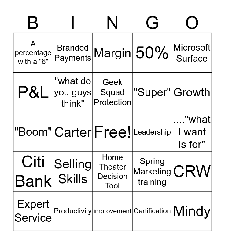 This bingo card has a free space and 24 words: Selling Skills, Productivity, Geek Squad Protection, Expert Service, Microsoft Surface, A percentage with a "6", P&L, Branded Payments, Leadership, Home Theater Decision Tool, "Super", "Boom", Spring Marketing training, CRW, "what do you guys think", Certification, ...."what I want is for", Margin, Growth, Carter, Mindy, Citi Bank, 50% and improvement.