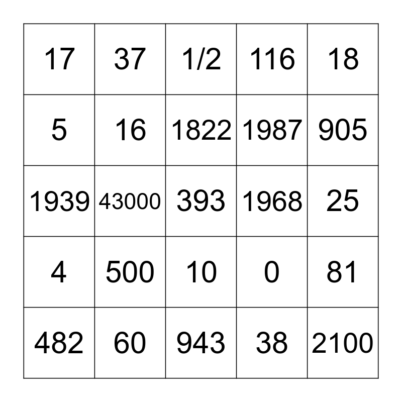 This bingo card has 40 words: 2, 1939, 2008, 16, 60, 10, 1822, 8, 18, 4, 43000, 116, 393, 25, 1968, 500, 2022, 17, 2/3, 1/2, 81, 38, 1987, 5, 1993, 3/5, 1840, 1902, 2100, 150000, 1/4, 482, 6, 0, 905, 943, 22, 99, 37 and 1779.