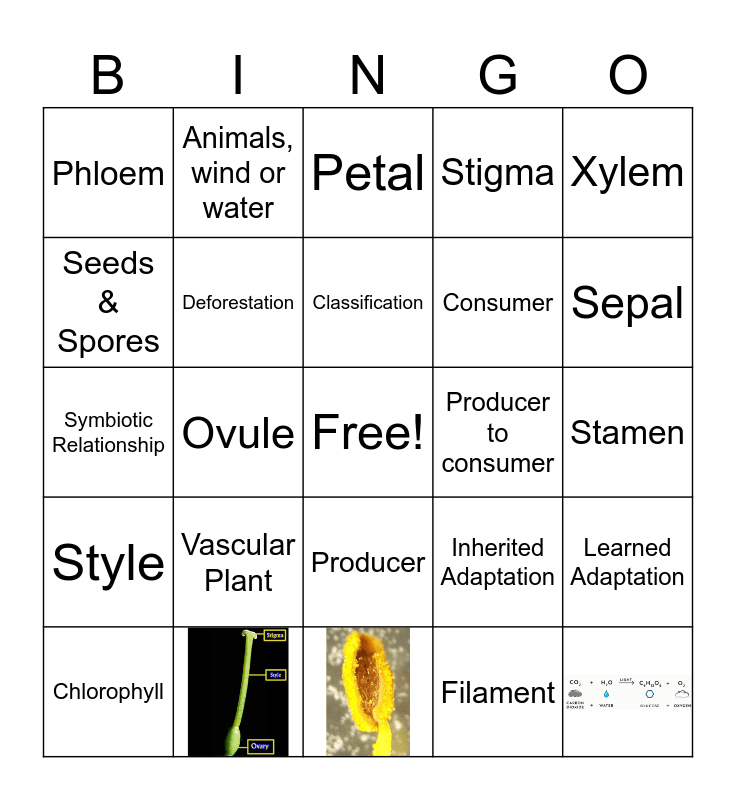 This bingo card has 3 images, a free space and 21 words: Vascular Plant, Classification, Chlorophyll, Xylem, Phloem, Seeds & Spores, Animals, wind or water, Producer to consumer, Producer, Consumer, Symbiotic Relationship, Inherited Adaptation, Learned Adaptation, Deforestation, Filament, Stamen, Petal, Sepal, Ovule, Style and Stigma.