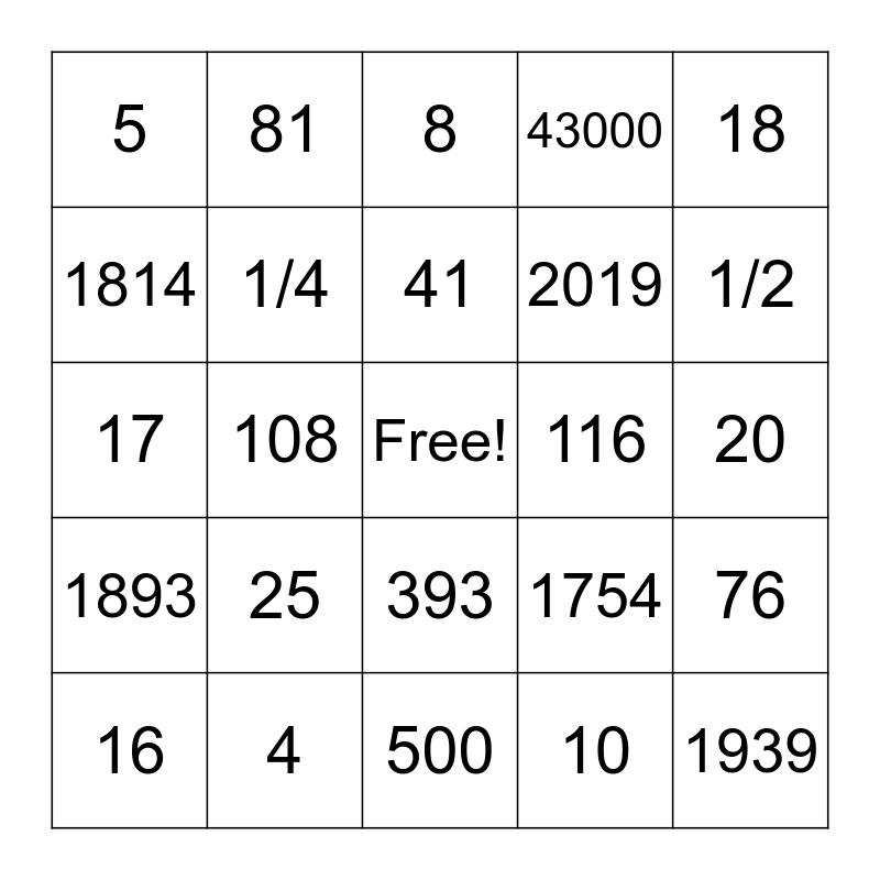 This bingo card has a free space and 43 words: 2, 1939, 2008, 16, 60, 10, 8, 1822, 18, 4, 43000, 116, 393, 25, 1968, 500, 2022, 17, 2/3, 1/2, 81, 38, 1987, 5, 1993, 20, 0, 6, 1754, 1893, 150000, 76, 1, 108, 69, 20000, 1924, 41, 1814, 2019, 905, 1/4 and 3/5.