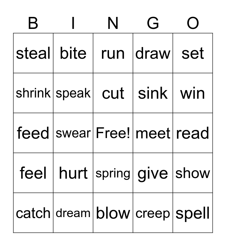 This bingo card has a free space and 123 words: arise, be, beat, become, begin, bend, bite, bleed, blow, break, bring, broadcast, build, burn, burst, buy, catch, choose, come, cost, creep, cut, deal, dig, do, draw, dream, drink, drive, eat, fall, feed, feel, fight, find, fly, forbid, forget, freeze, get, give, go, grow, hang, have, hear, hide, hit, hold, hurt, keep, kneel, know, lay, lead, lean, learn, leave, lend, let, lie, light, lose, make, mean, meet, pay, put, read, ride, ring, rise, run, say, see, sell, send, set, sew, shake, shine, shoot, show, shrink, shut, sing, sink, sit, sleep, slide, smell, sow, speak, spell, spend, spill, spit, split, spoil, spread, spring, stand, steal, stick, sting, strike, swear, sweep, swell, swim, swing, take, teach, tear, tell, think, throw, understand, wake, wear, weep, win and write.