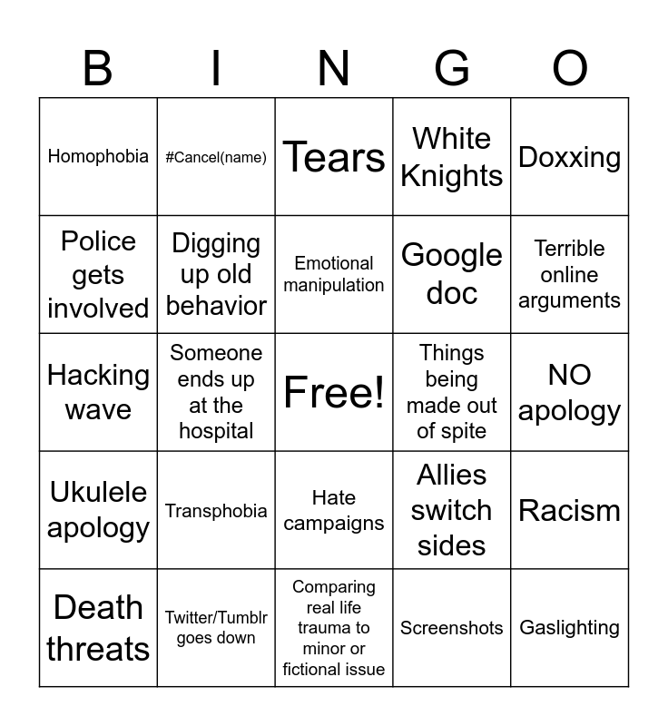 This bingo card has a free space and 24 words: Transphobia, Twitter/Tumblr goes down, Emotional manipulation, Death threats, Doxxing, Homophobia, Police gets involved, #Cancel(name), Things being made out of spite, Hate campaigns, Google doc, Hacking wave, Allies switch sides, Racism, Digging up old behavior, Screenshots, NO apology, Tears, Terrible online arguments, Someone ends up at the hospital, Gaslighting, Ukulele apology, White Knights and Comparing real life trauma to minor or fictional issue.