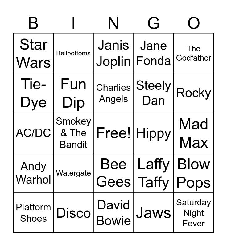 This bingo card has a free space and 24 words: Watergate, Disco, Charlies Angels, Platform Shoes, The Godfather, Star Wars, Tie-Dye, Bellbottoms, Hippy, Bee Gees, Steely Dan, AC/DC, Laffy Taffy, Blow Pops, Fun Dip, Jaws, Mad Max, Janis Joplin, Rocky, Smokey & The Bandit, Saturday Night Fever, Andy Warhol, Jane Fonda and David Bowie.