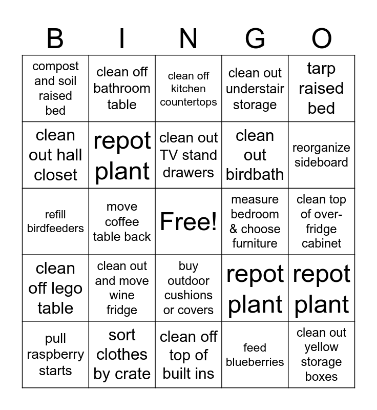 This bingo card has a free space and 25 words: clean out and move wine fridge, clean off top of built ins, clean out TV stand drawers, pull raspberry starts, tarp raised bed, compost and soil raised bed, clean out hall closet, clean off bathroom table, measure bedroom & choose furniture, buy outdoor cushions or covers, clean out birdbath, refill birdfeeders, repot plant, repot plant, repot plant, move cedar planters to backyard, clean top of over-fridge cabinet, clean off kitchen countertops, reorganize sideboard, move coffee table back, clean out yellow storage boxes, sort clothes by crate, clean off lego table, clean out understair storage and feed blueberries.