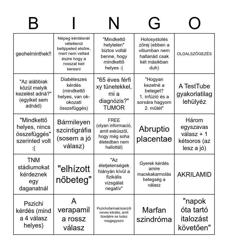 This bingo card has a free space and 24 words: "elhízott nőbeteg", A verapamil a rossz válasz, "65 éves férfi xy tünetekkel, mi a diagnózis?" TUMOR, Pszichi kérdés (mind a 4 válasz helyes), OLDALSZÖGEZÉS, geohelminthek!!, "Az alábbiak közül melyik kezelést adná?" (egyiket sem adnád), Népeg kérdésnél véletlenül betippeled elsőre, mert nem vetted észre hogy a rosszat kell keresni, Abruptio placentae, "Az életjelenségek hiányán kívül a fizikális vizsgálat negatív", "Hogyan kezelné a beteget? 1. infúzió és a sorsára hagyom 2. műtét", "Mindkettő helyes, nincs összefüggés" szerinted volt :(, Gyerek kérdés amire macskakarmolás betegség a válasz, AKRILAMID, Diabéteszes kérdés (mindkettő helyes, van ok-okozati összefüggés), Marfan szindróma, Három egyszavas válasz + 1 kétsoros (az lesz a jó), "Mindkettő helytelen" biztos voltál benne, hogy mindkettő helyes :(, A TestTube gyakorlatilag lehülyéz, Bármileyen szcintigráfia (sosem a jó válasz), "napok óta tartó italozást követően", TNM stádiumokat kérdeznek egy daganatnál, Holosystolés zörej (ebben a vitiumban nem hallanád csak két másikban duh) and Pszichofarmak/szerzői neves kérdés, amit tizedjére se tudsz megjegyezni.