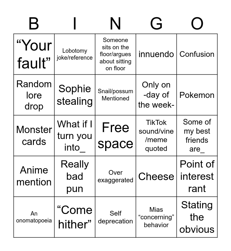 This bingo card has a free space and 24 words: Really bad pun, “Come hither”, Snail/possum Mentioned, An onomatopoeia, Confusion, “Your fault”, Random lore drop, Lobotomy joke/reference, TikTok sound/vine /meme quoted, Over exaggerated, Only on -day of the week-, Monster cards, Cheese, Point of interest rant, Sophie stealing, Mias “concerning” behavior, Some of my best friends are_, Someone sits on the floor/argues about sitting on floor, Pokemon, What if I turn you into_, Stating the obvious, Anime mention, innuendo and Self deprecation.