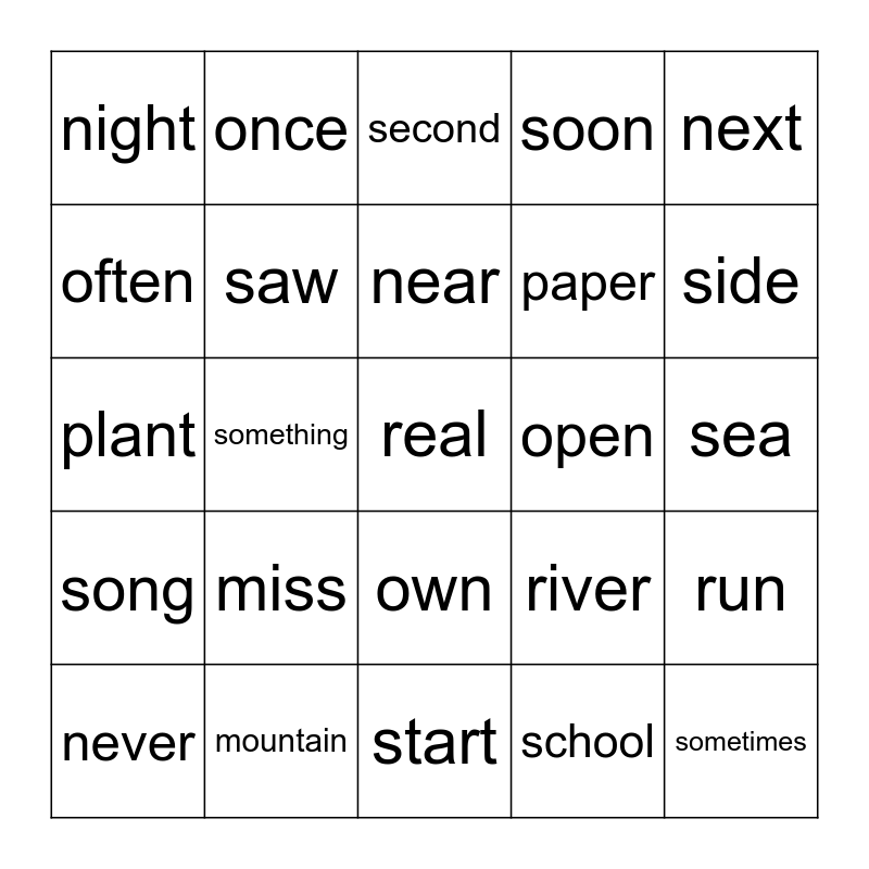 This bingo card has a free space and 24 words: miss, mountain, near, never, next, night, often, once, open, own, paper, plant, river, run, saw, school, sea, second, side, something, sometimes, song, soon and start.