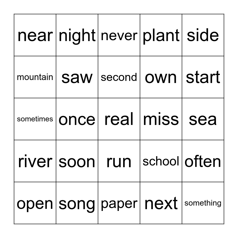 This bingo card has a free space and 24 words: soon, song, second, open, side, near, mountain, night, miss, run, own, sometimes, school, often, saw, next, sea, never, start, once, something, river, plant and paper.