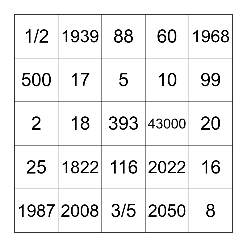 This bingo card has 32 words: 2050, 81, 18, 167, 25, 17, 1968, 16, 1939, 8, 5, 88, 72, 38, 43000, 4, 1987, 2, 116, 1822, 2022, 1993, 20, 2008, 393, 60, 10, 500, 1/2, 3/5, 2/3 and 99.