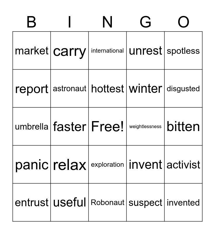 This bingo card has a free space and 30 words: useful, fabric, faster, cutting, market, international, astronaut, exploration, weightlessness, Robonaut, bitten, invented, suspect, tablet, disgusted, inland, invent, panic, relax, spotless, umbrella, weather, carry, winter, report, unrest, activist, entrust, hottest and enlist.
