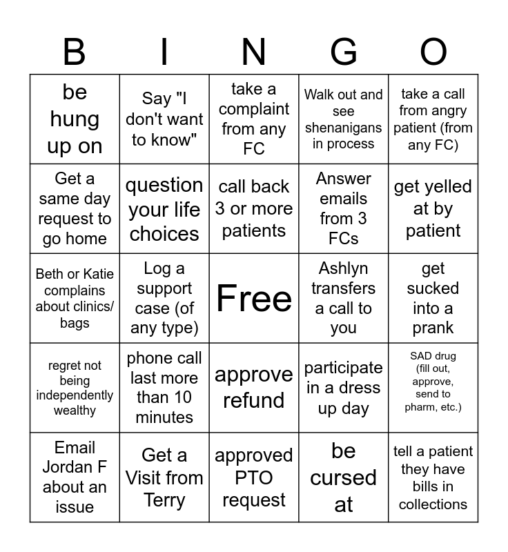 This bingo card has a free space and 24 words: phone call last more than 10 minutes, Get a Visit from Terry, call back 3 or more patients, Email Jordan F about an issue, take a call from angry patient (from any FC), be hung up on, Get a same day request to go home, Say "I don't want to know", Ashlyn transfers a call to you, approve refund, Answer emails from 3 FCs, Beth or Katie complains about clinics/ bags, participate in a dress up day, SAD drug (fill out, approve, send to pharm, etc.), question your life choices, be cursed at, get sucked into a prank, take a complaint from any FC, get yelled at by patient, Log a support case (of any type), tell a patient they have bills in collections, regret not being independently wealthy, Walk out and see shenanigans in process and approved PTO request.