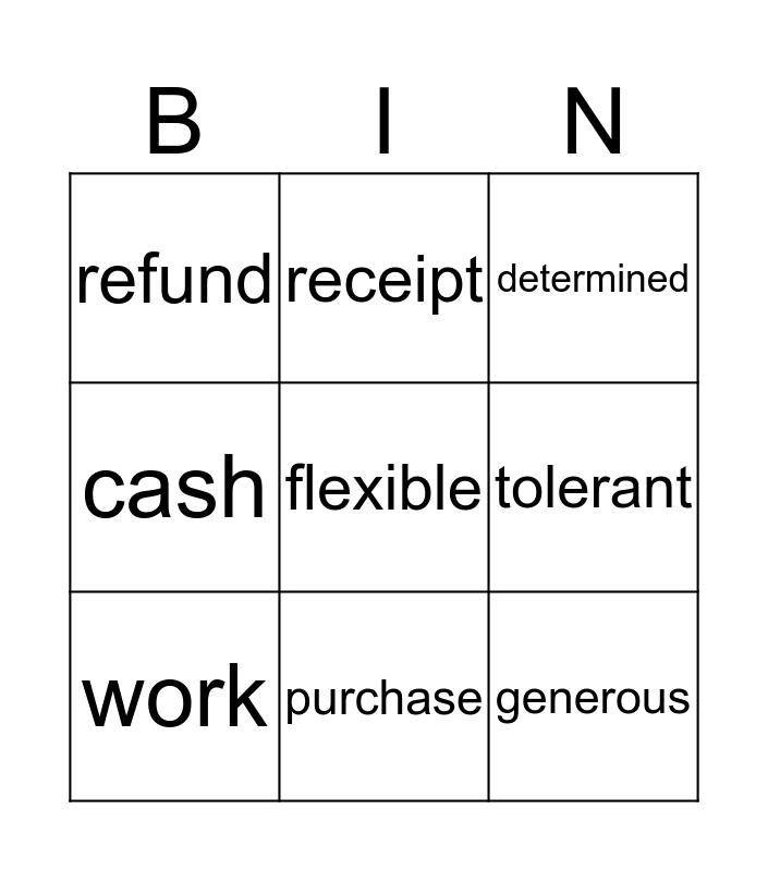 This bingo card has a free space and 12 words: earn, break up with, generous, tolerant, receipt, determined, purchase, coin, refund, cash, work and job.